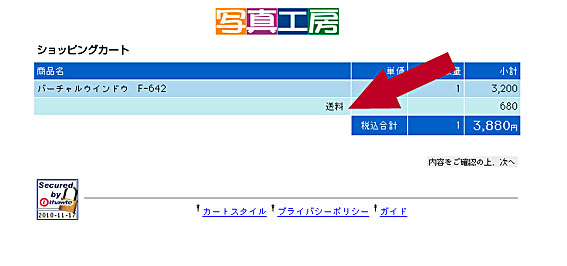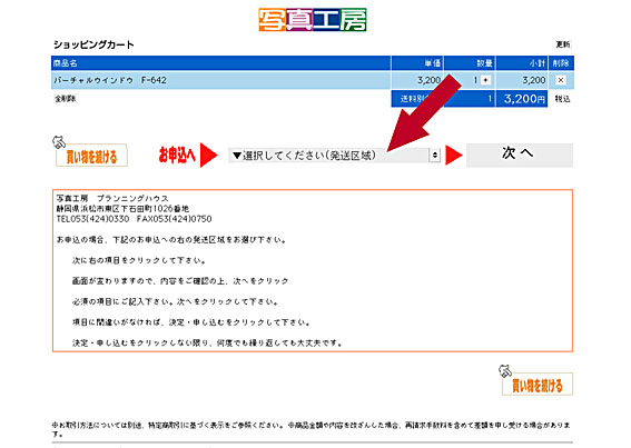 送料の金額が入り、合計金額が計算されます。 内容をご確認の上、次へをクリックします。 |
