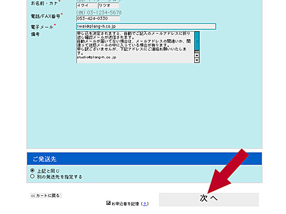 記入に間違いが無ければ、下の注文を完了するをクリックしてください。 | |