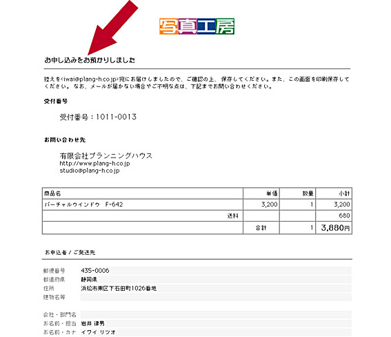 お申し込みをお預かりしました と画面が変わります。 これでご注文が完了しました。 自動で今ご注文内容が直ぐにメールされます。 メールが受信出来ない場合は、記入メールアドレスの間違いか 通常営業時間内に、弊社から確認メールをいたします。 確認メールもこない場合は、お手数ですがご連絡ください。